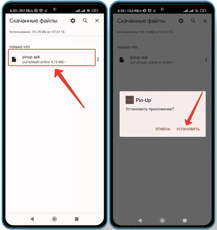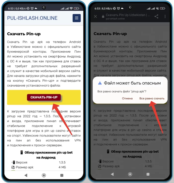 Скачать Pin up apk на телефон Android в Узбекистане можно с официального сайта букмекерской конторы. Приложение Пин Ап можно установить на смартфоны Андроид с ОС 4 и выше, так как программа для ставок не требует дополнительных разрешений и служит в качестве мобильной версии сайта. Для начала загрузки pinup.apk файла, нажмите на кнопку «Скачать Pin-up» и подтвердите скачивание установочного файла: